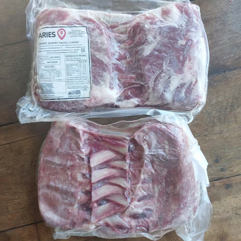 Carré de cordeiro curto uruguaio (short rack). Produto congelado com peso médio de 0,850 kg.