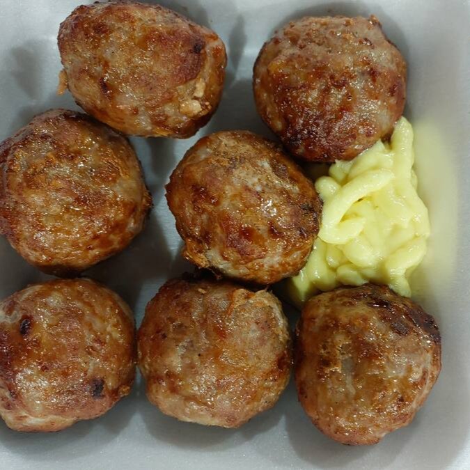 Porção De Almôndegas Recheada Com Muçarela. Acompanha Molho De Creme De Alho.