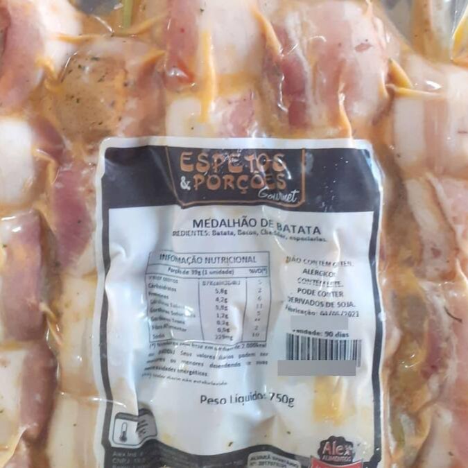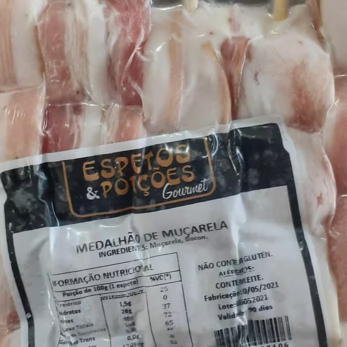 Espetinho de queijo muçarela enrolado numa fatia de bacon. Produto congelado e embalado a vácuo em pacotes de 500g contendo 5 unidades.