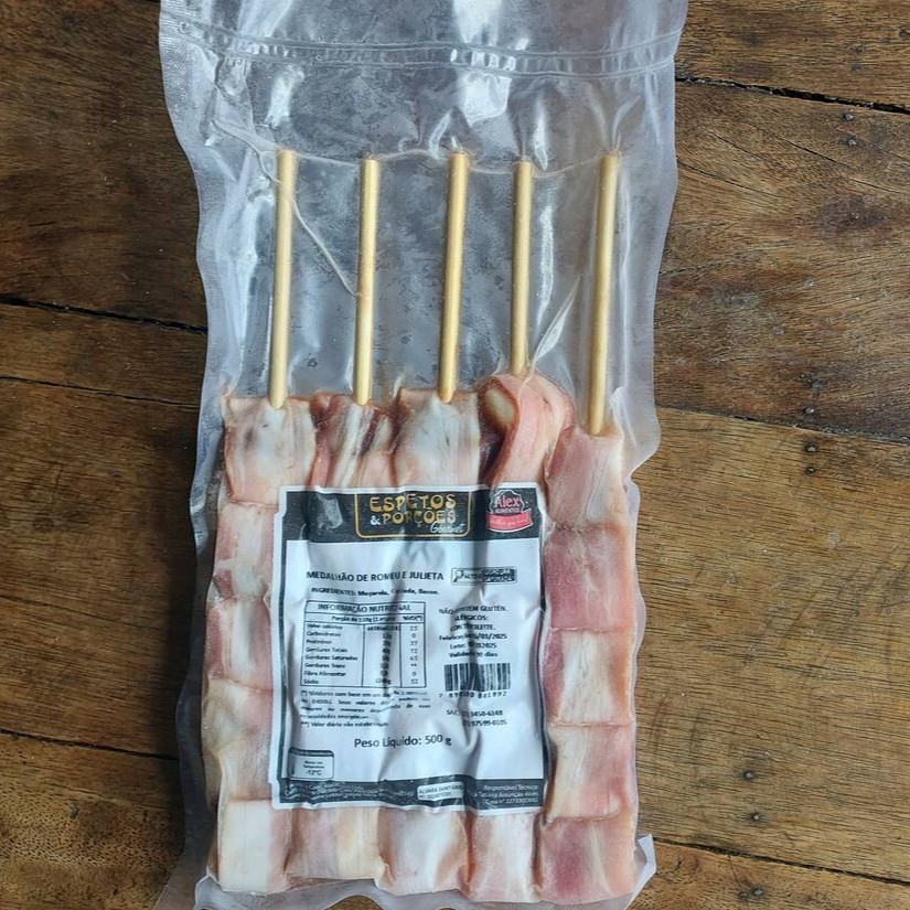 Pacote contendo 5 espetos de medalhão de muçarela e goiabada, envolvido com baicon. Gramatura de 500 gr.