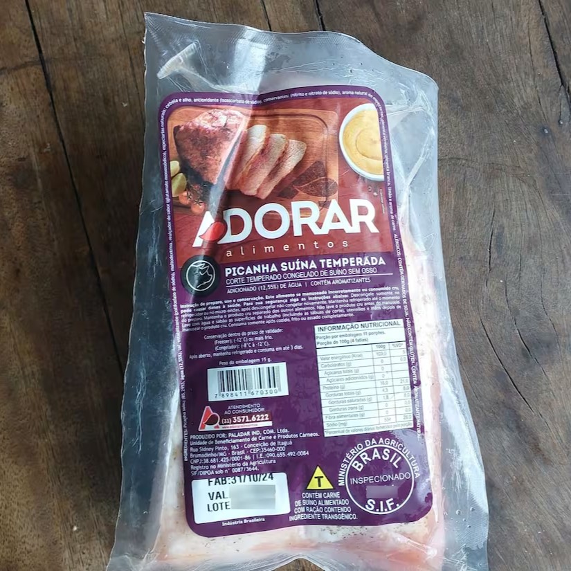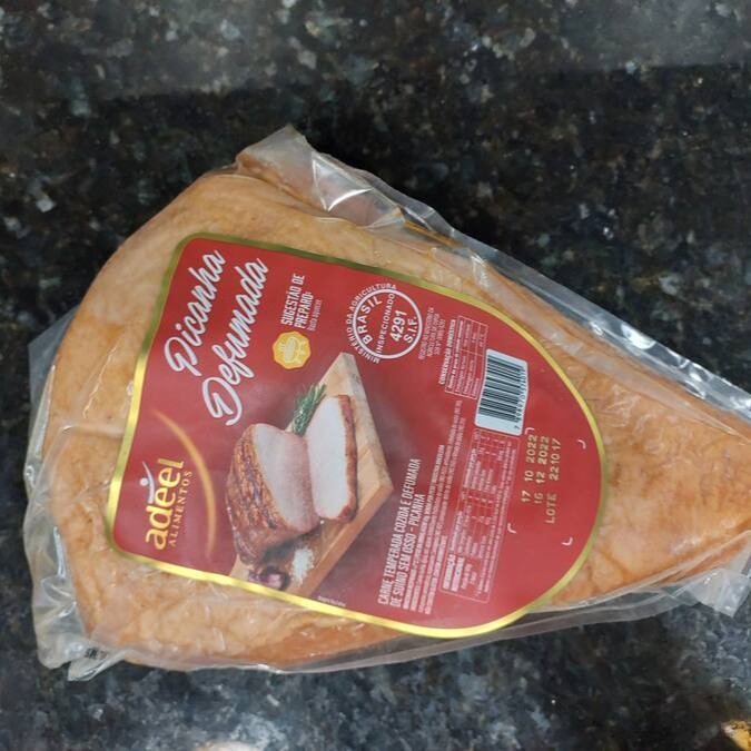 Carne temperada cozida e defumada de suíno sem osso - picanha. Peso médio da peça: 0,950 kg