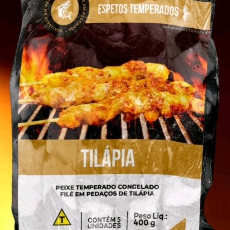Espeto de Tilápia temperado e congelado. Embalagem com 400 gramas contém 5 espetos. Produto delicioso e super prático.