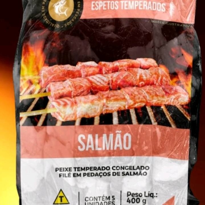 Espeto de Salmão, temperado e congelado. Embalagem com 400 gramas contém 5 espetos. Produto delicioso e super prático.