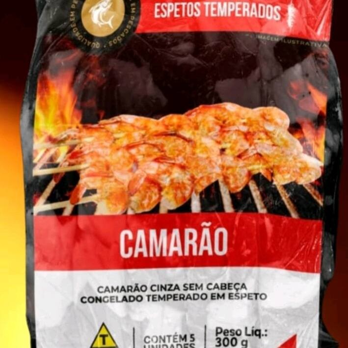 Espeto de camarão cinza, temperado e congelado. Embalagem com 300 gramas contém 5 espetos. Produto delicioso e super prático.