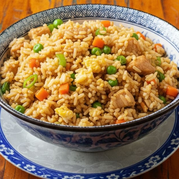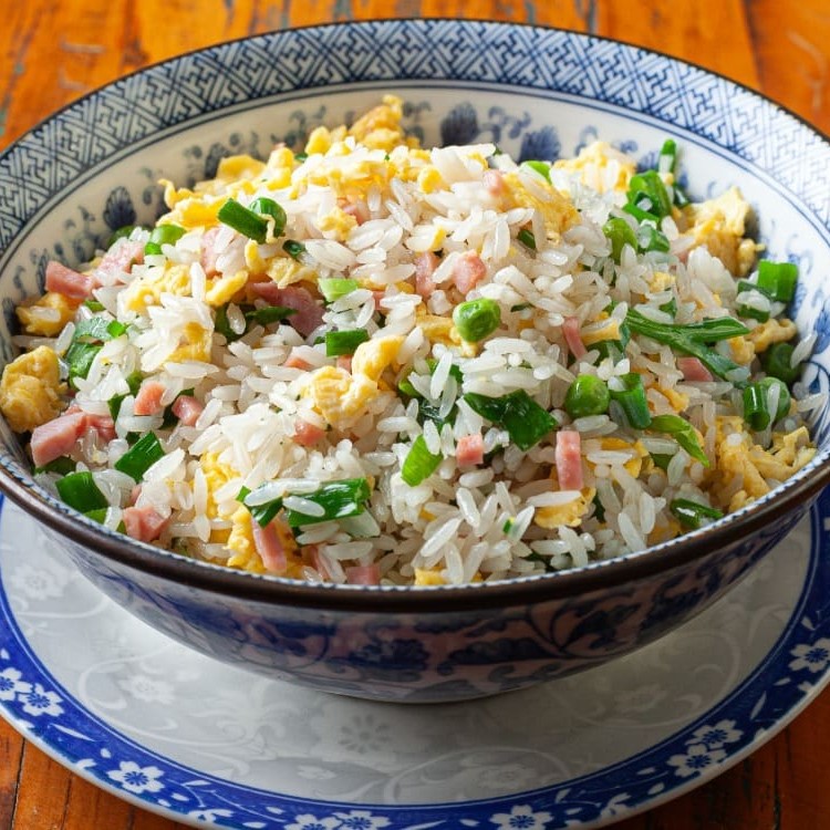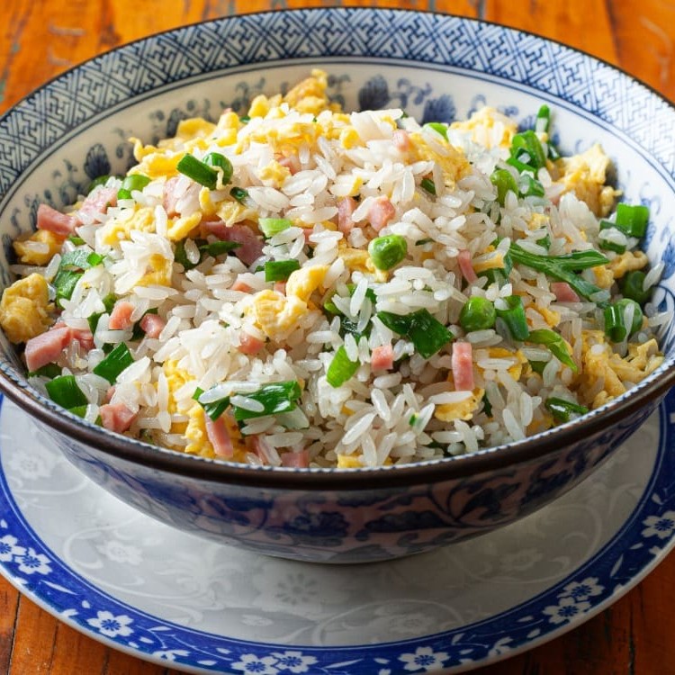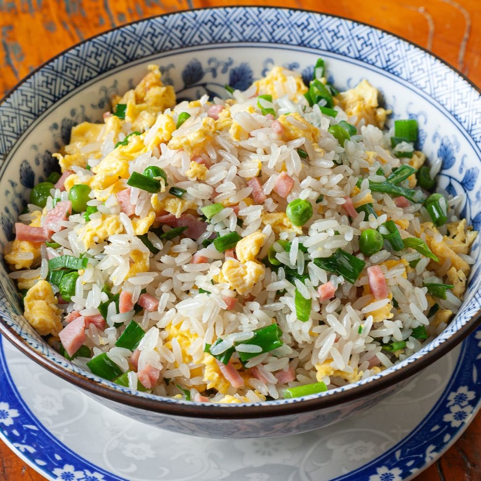 Arroz, ovos, presunto, ervilha e cebolinha.