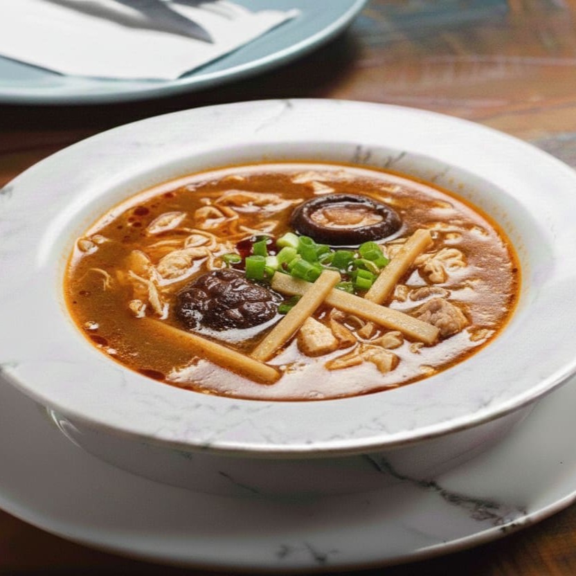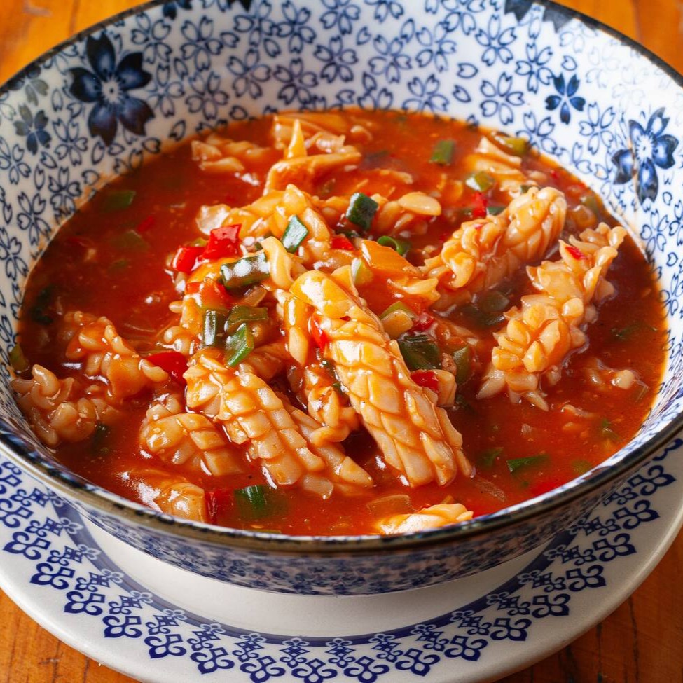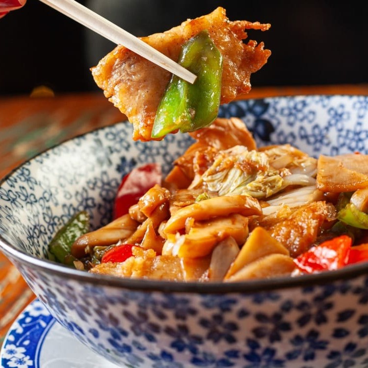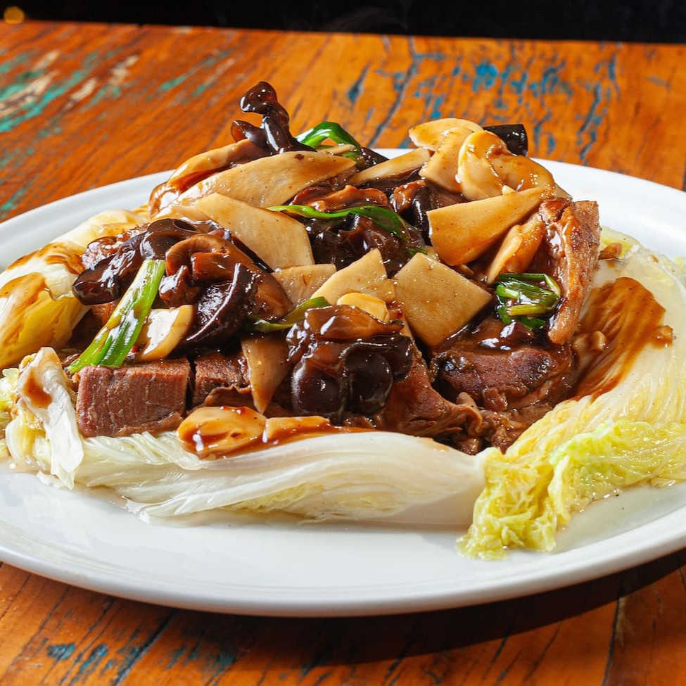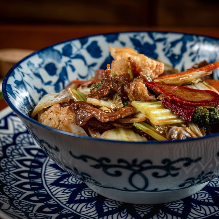 Carne bovina, tofú, ovos, pimenta, vinagre e bambu. Acompanha pão chinês (bun).