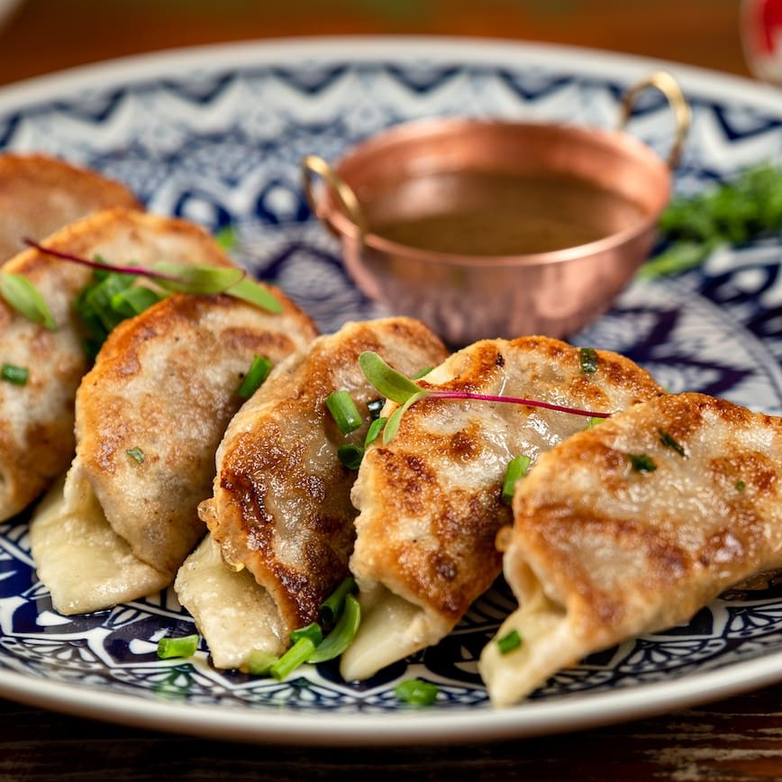 Pastéis chineses recheados com carne de porco. Acompanha 1 molho de gengibre da casa.
