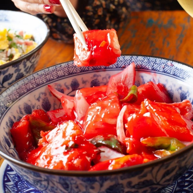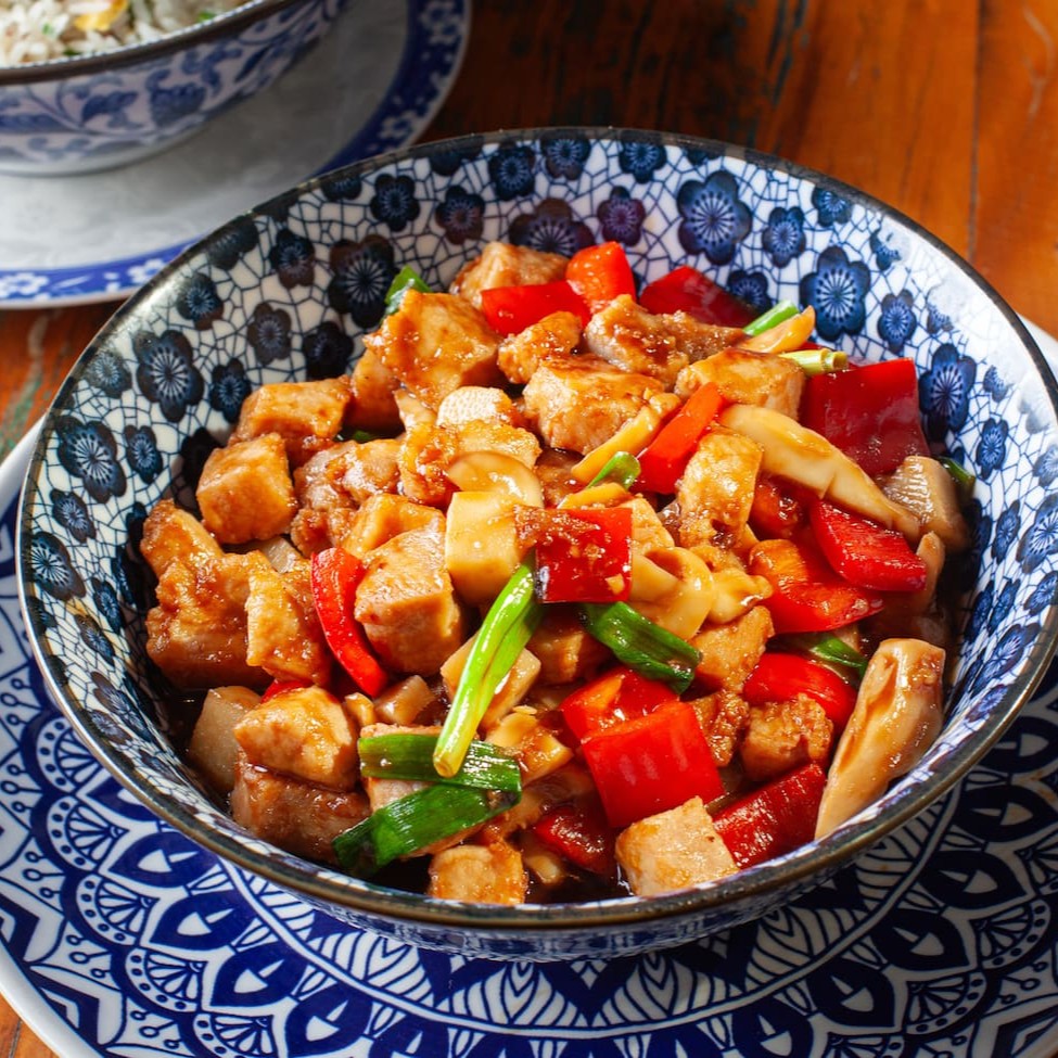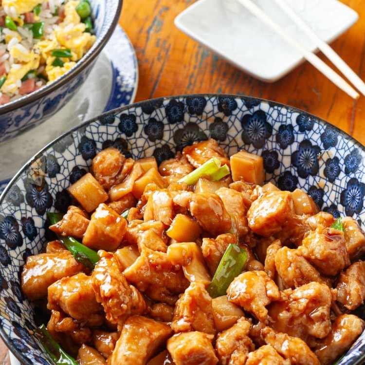 Lombo suíno, pimentão, cebola e abacaxi ao molho agridoce. Serve 2 pessoas.