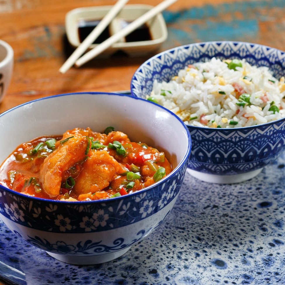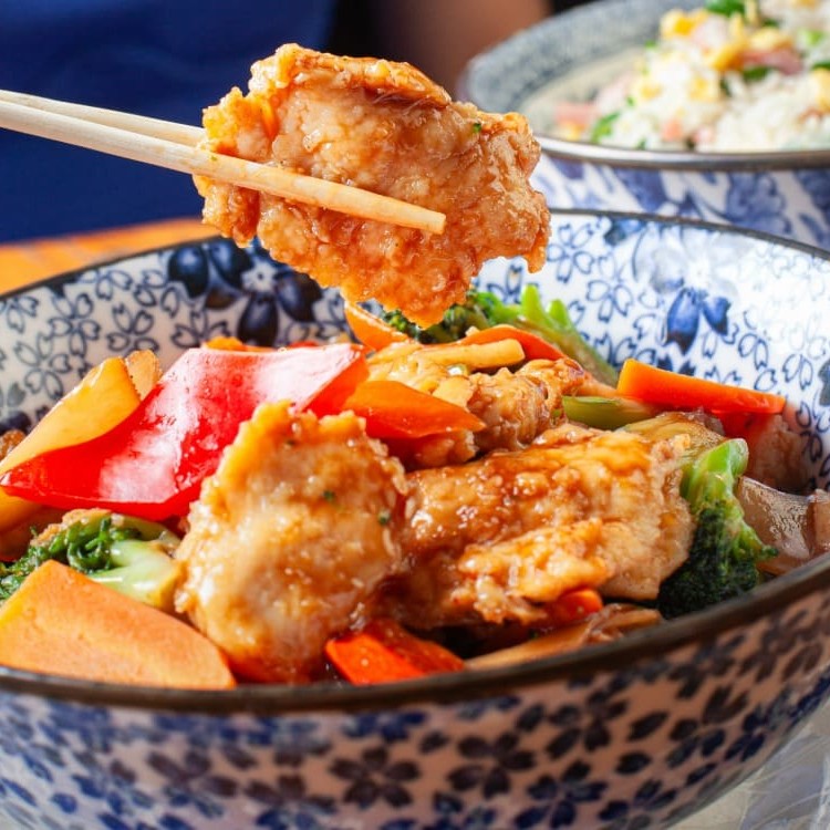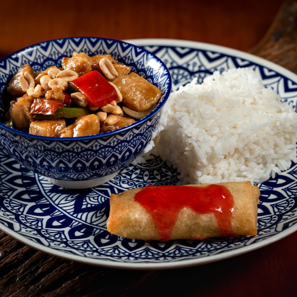 Combo frango xadrez (2 pessoas) + 2 harumakis + arroz chop suey (2 pessoas). Acompanha molho agridoce da casa.