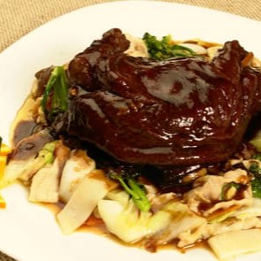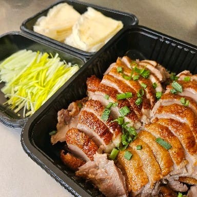 Pato laqueado, alho poró, molho especial e discos de massa fina (pedido com antecedência de 48hrs).