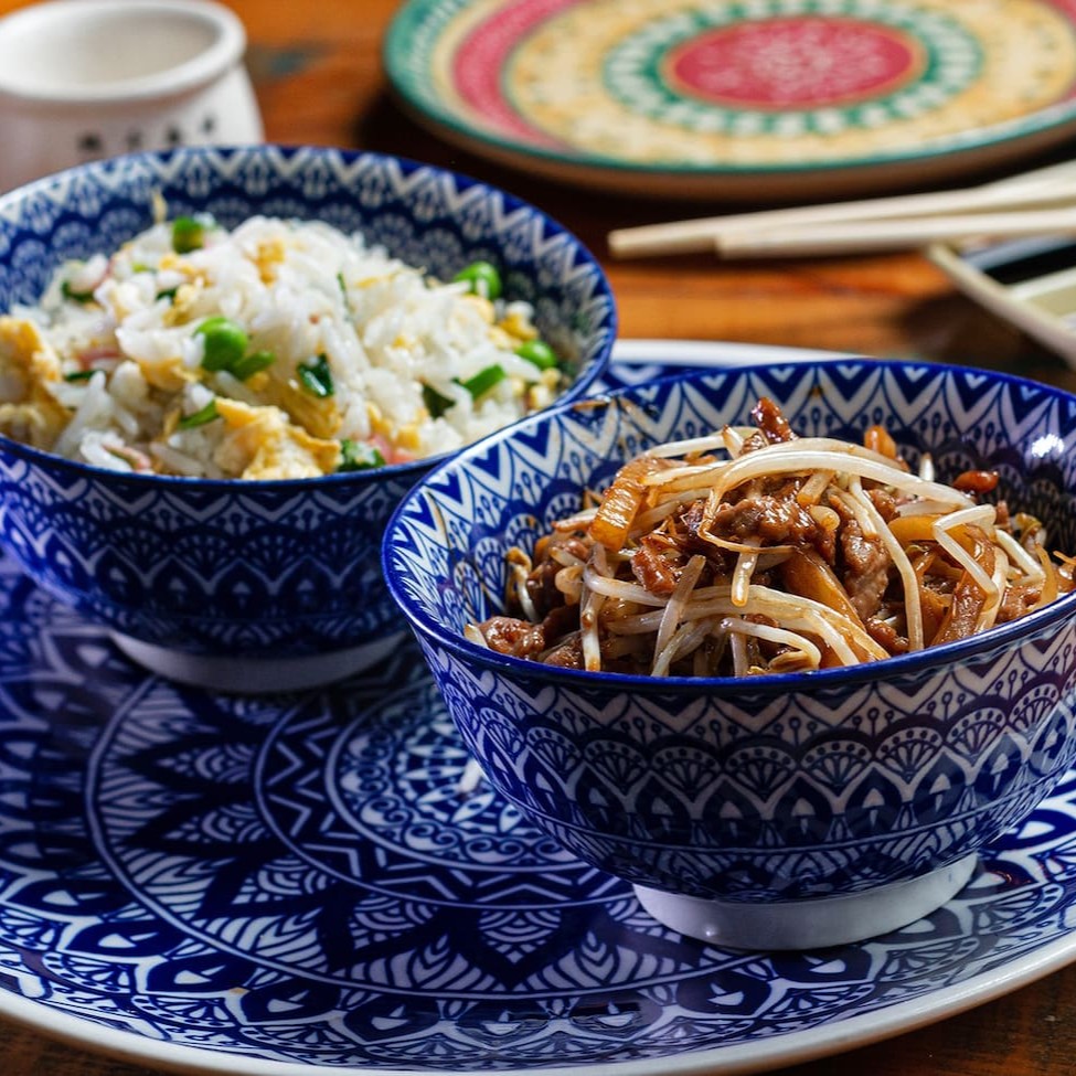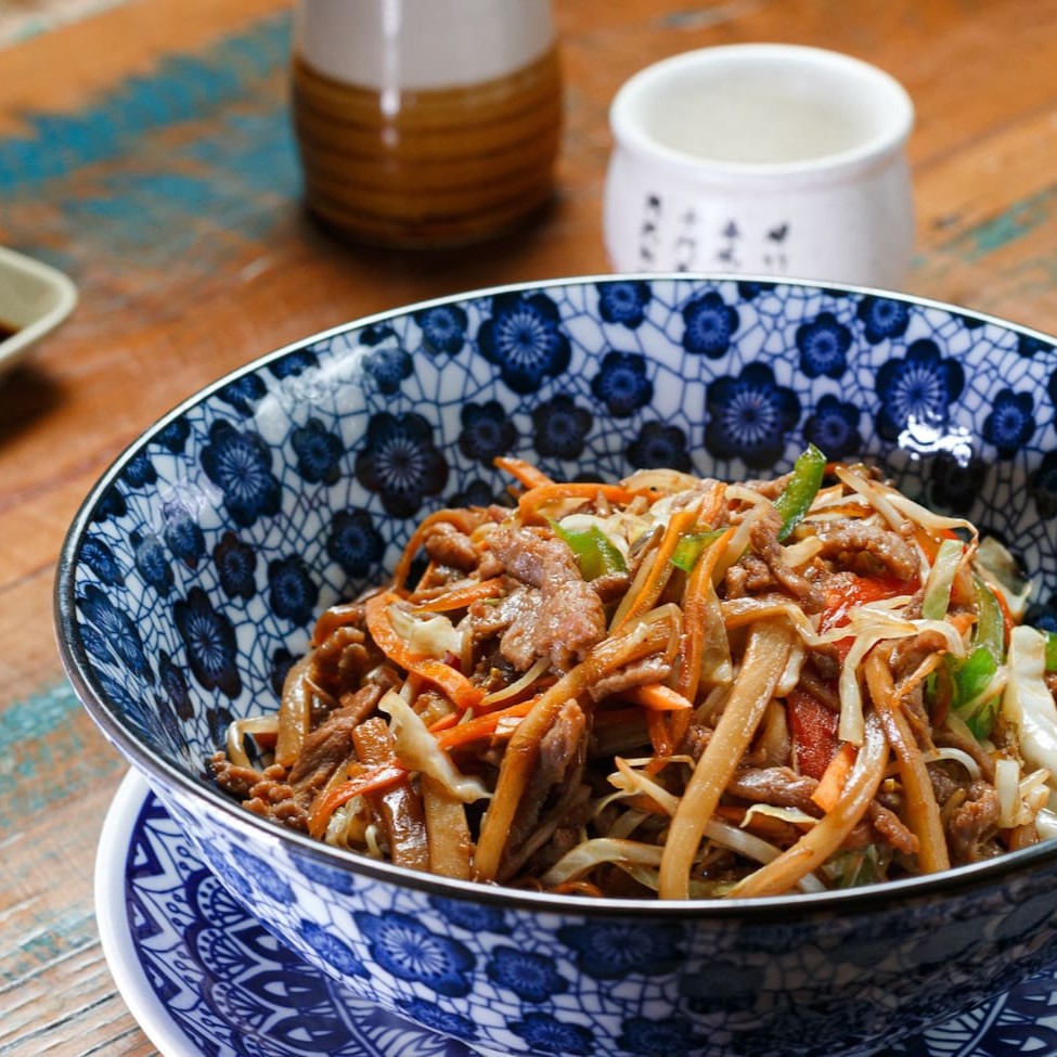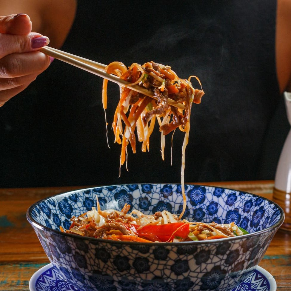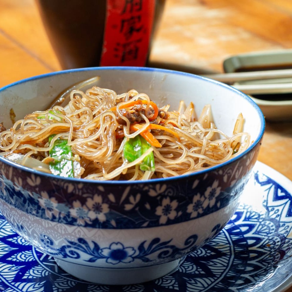 Macarrão de arroz (bifum), carne bovina, ovos, acelga, cenoura, broto de feijão, bambu, cebola e cebolinha. Serve 2 pessoas.