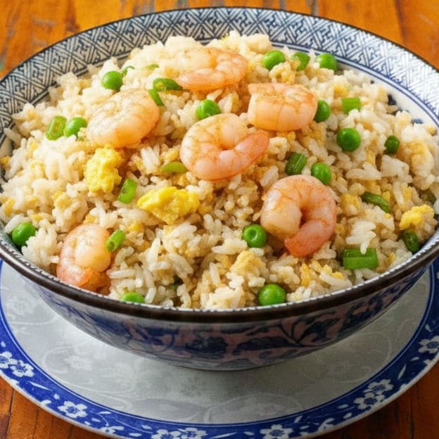 Arroz, camarão, ovos, cebolinha e ervilhas.