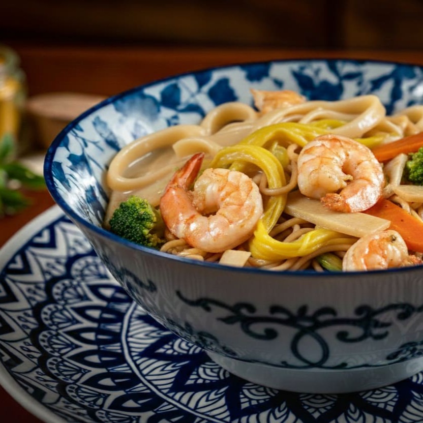 Massa artesanal, camarão, acelga, brócolis, couve flor, cenoura, bambu e cogumelo shitake.