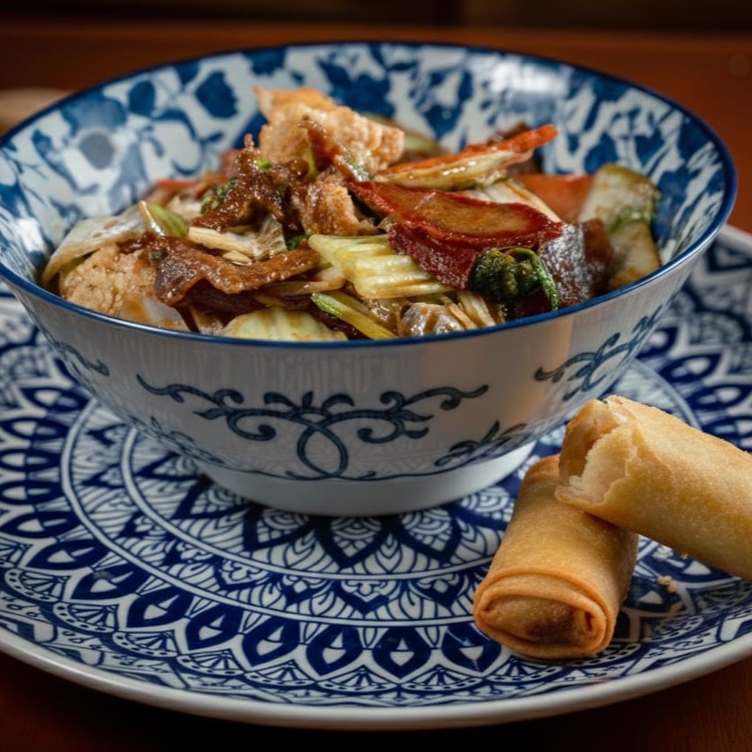 Combo 2 rolinhos primavera + yakisoba (2 pessoas). Acompanha molho agridoce da casa.
