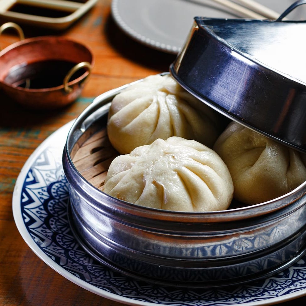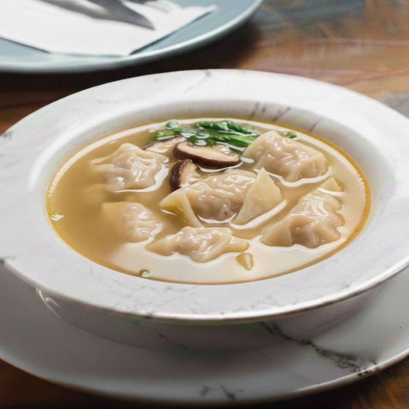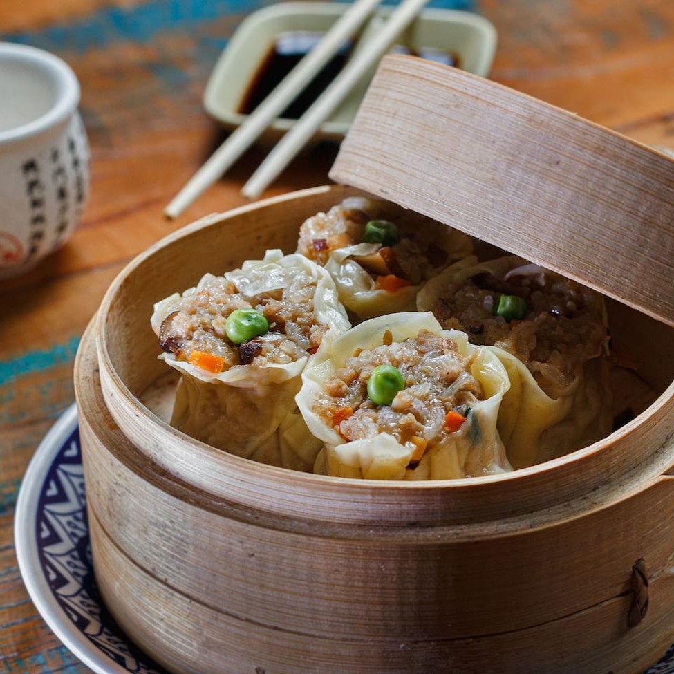 Massa (tipo capeletti) recheada com carne suína, acelga, cenoura, cogumelo champignon e bambu. Acompanha pão chinês (bun).