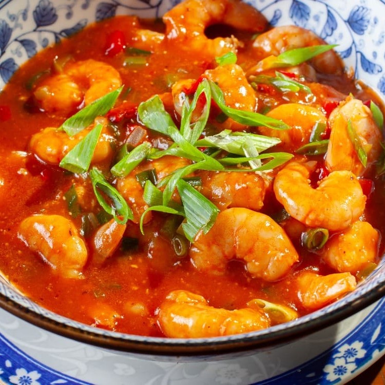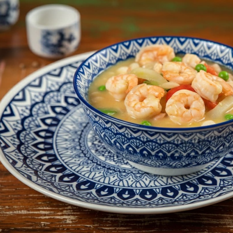 Camarões flambados ao molho curry, com pimentão e cebola.