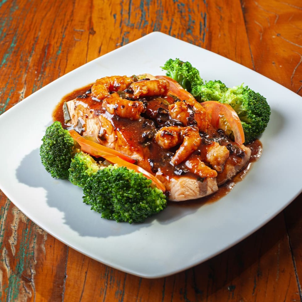 Camarão, brócolis, pimentão, cebola, gengibre e alho.