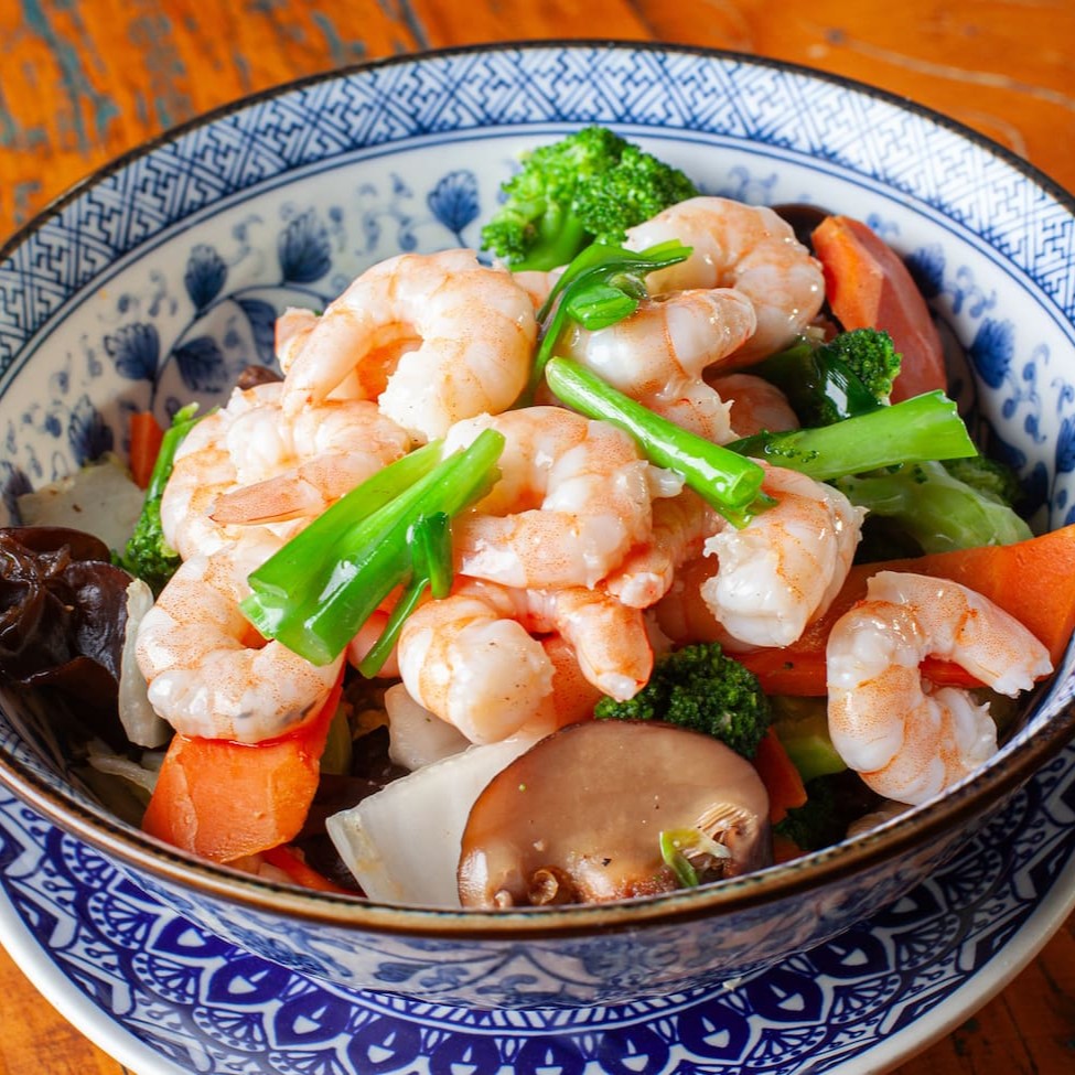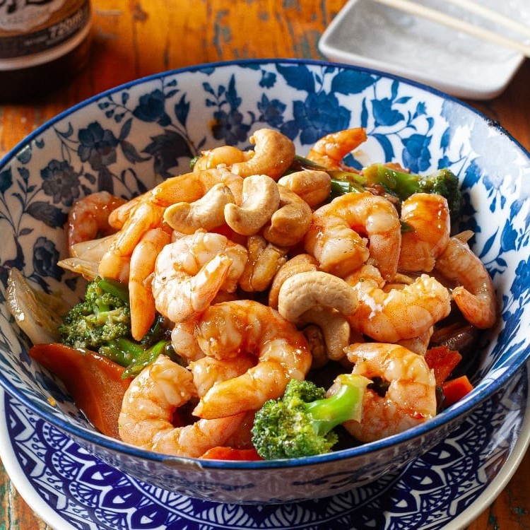 Camarão, castanha de caju, acelga, cenoura, cogumelo, algas, cogumelos shitake, brócolis e bambu.