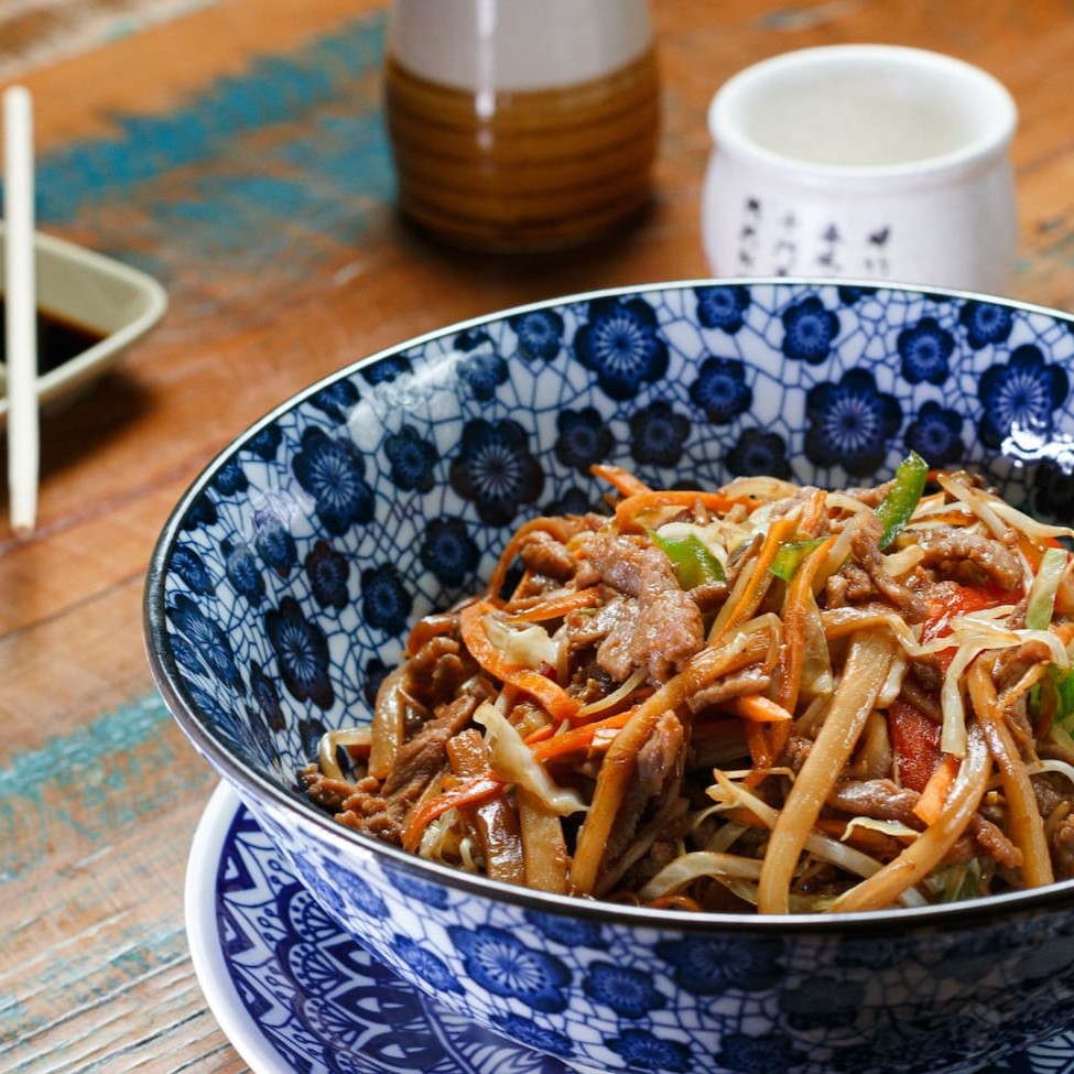 Carne bovina desfiada, pimentão verde, vermelho, cebola, bambu, repolho e broto de feijão
