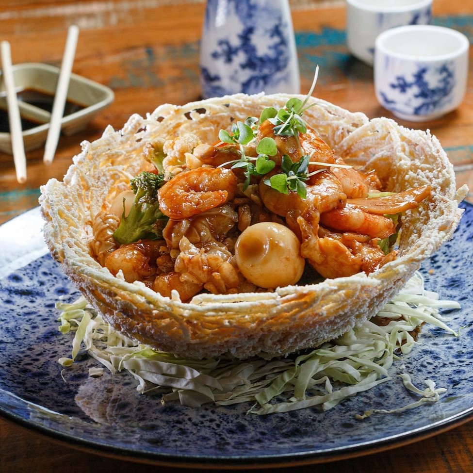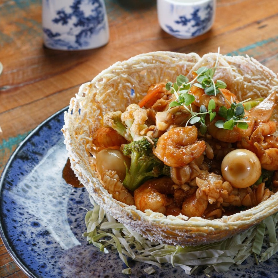 Mix de frutos do mar, brócolis, couve flor, cenoura, pimentão verde, vermelho, acelga, cogumelo e bambu servidos na cesta de batata crocante.