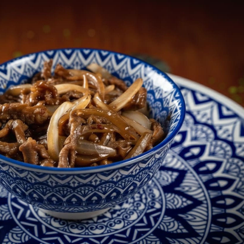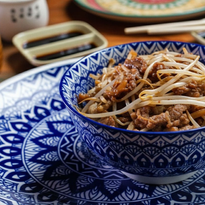 Carne bovina, moyashi (broto de feijão) e broto de bambu.