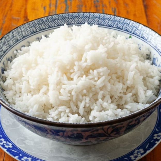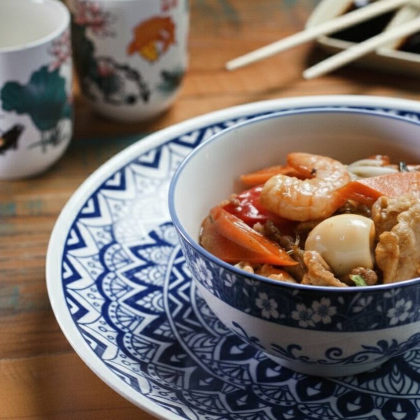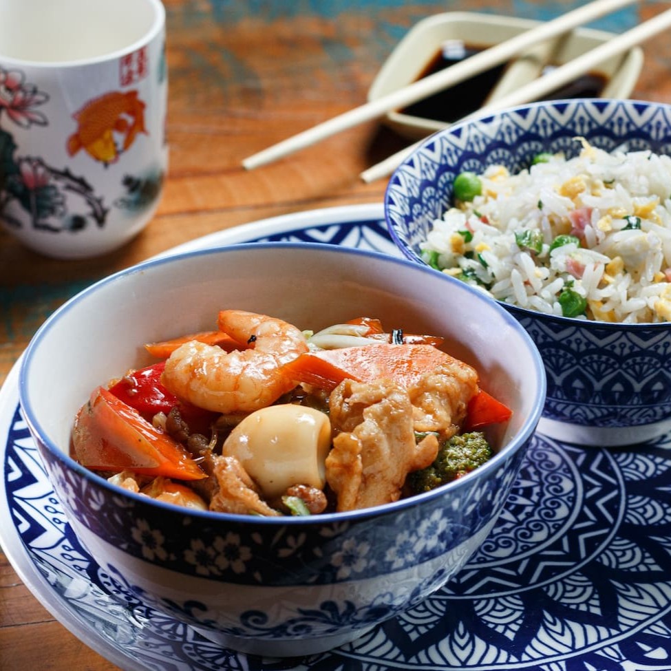 Arroz frito, camarão, carne suína, ervilha, bambu e cogumelo