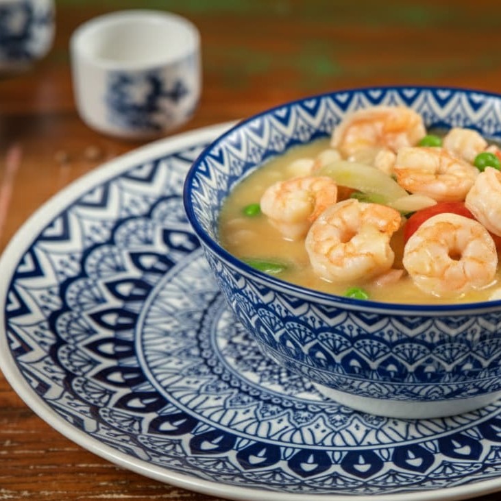 Camarão sem casca, brócolis, acelga, cenoura, bambu, algas e cogumelos shitake.