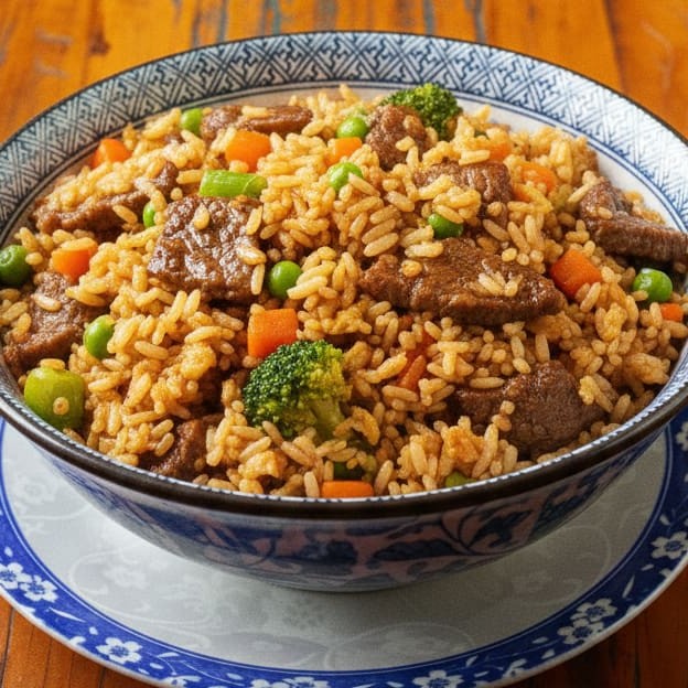 Arroz, carne, cebolinha, ervilha, ovos, cenoura e brócolis.