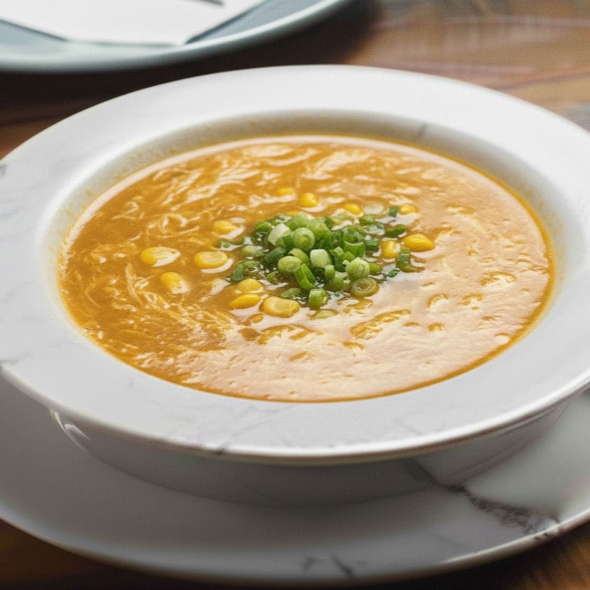 Milho verde, ovos e ervilha. Acompanha pão chinês (bun).