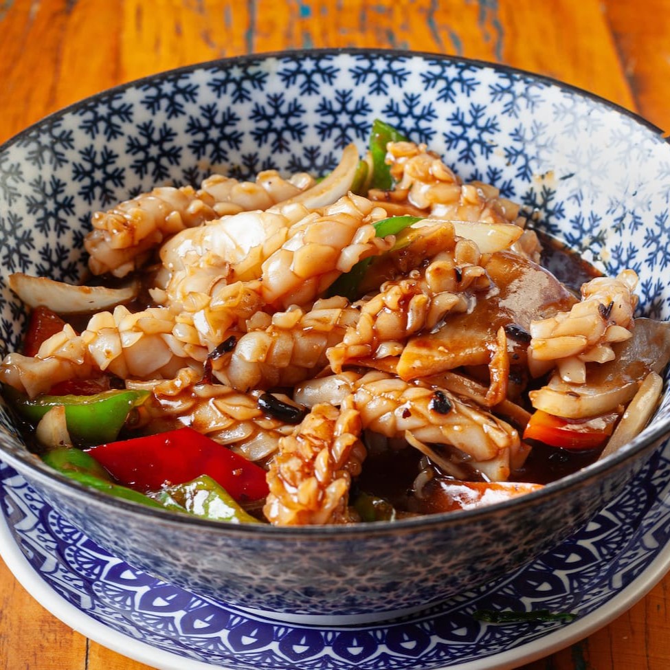 Lula, taussy (feijão preto), cebola, bambu e pimentão.