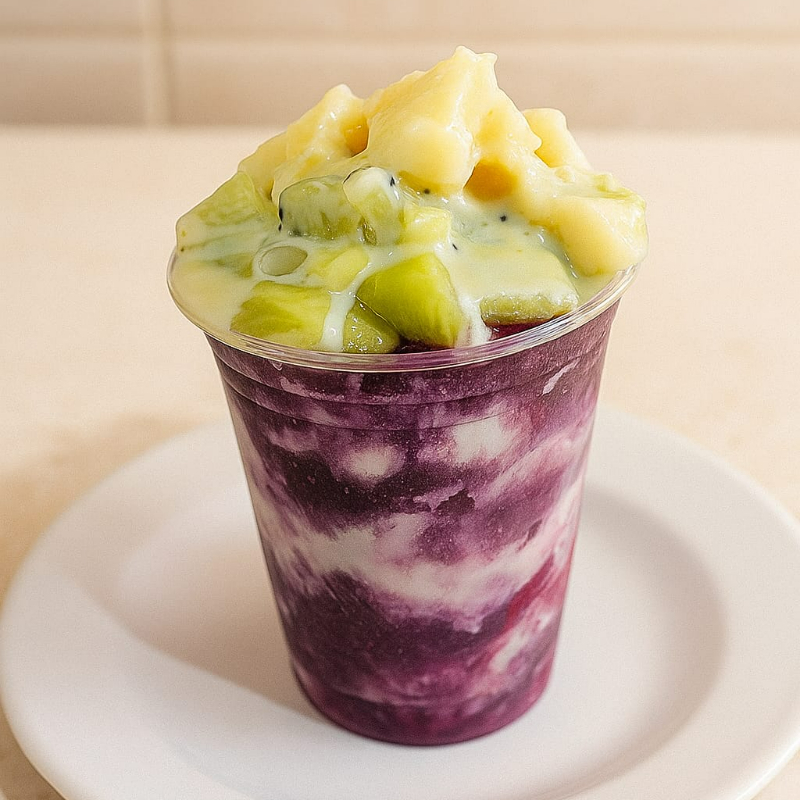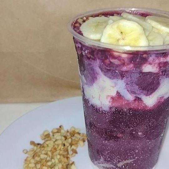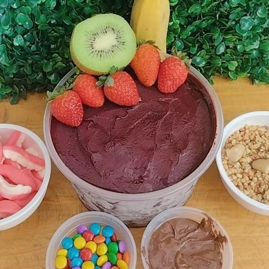 Creme de açaí delicioso e cremoso, abacaxi, kiwí e leite condensado. Não mandamos adicionais separados, vão em camadas nos copos. Não trocamos adicionais, apenas retiramos.