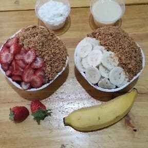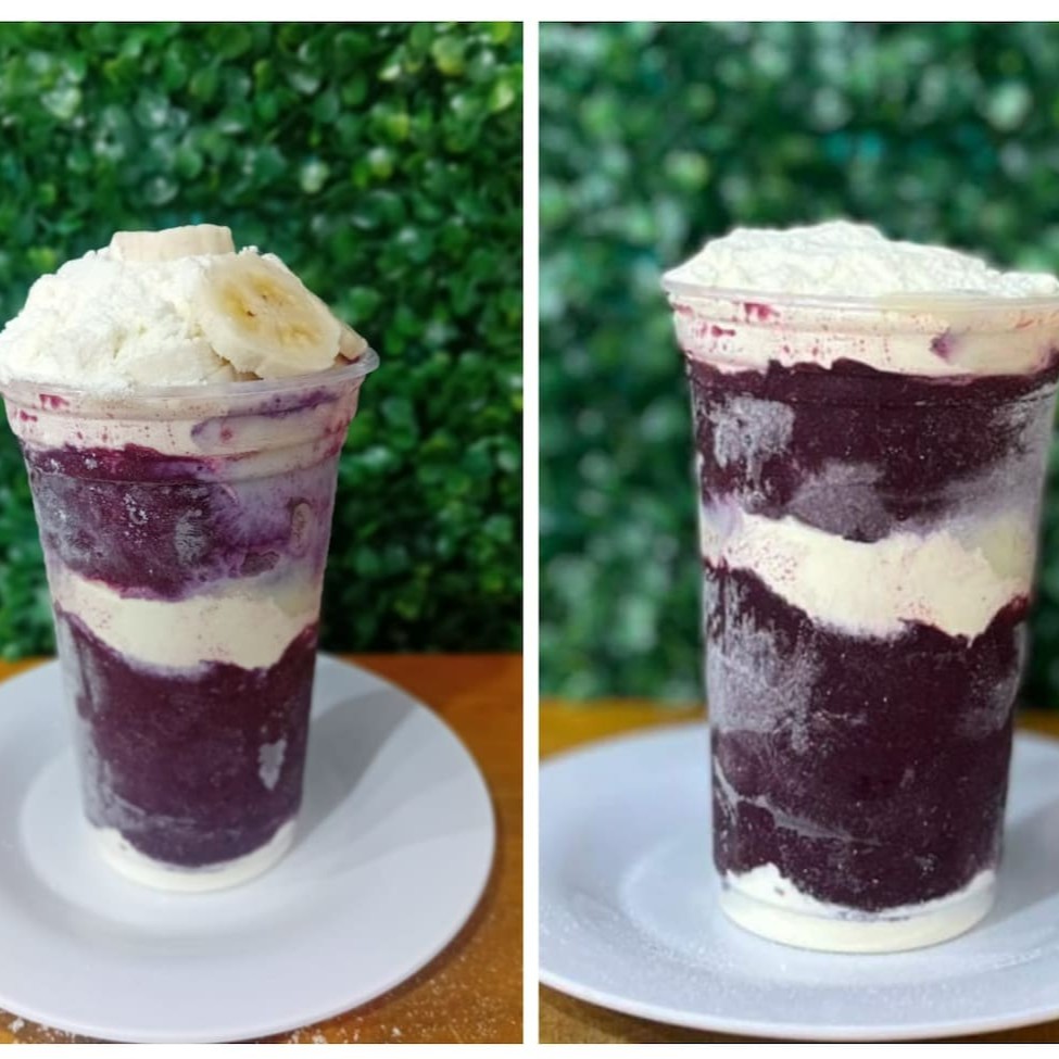1 copo de 300 ml de açaí, com morango, paçoca e leite condensado. 1 copo de 300 ml de açaí, com banana, paçoca e leite em pó.