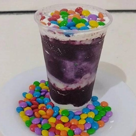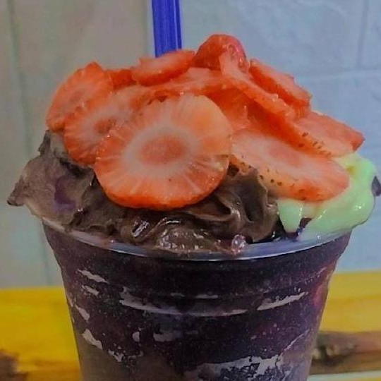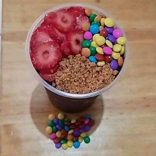 Creme de açaí, morango, confetes e paçoca.