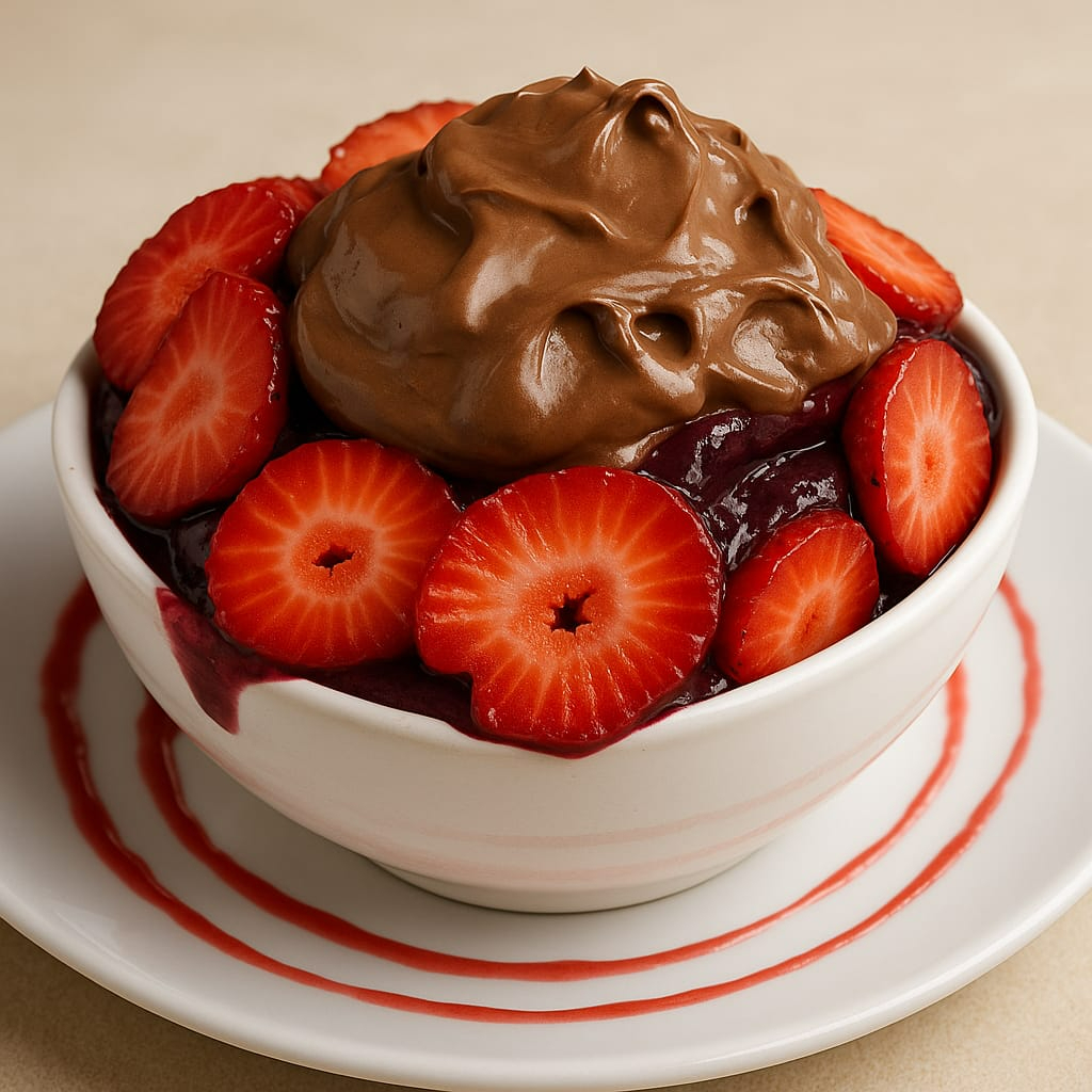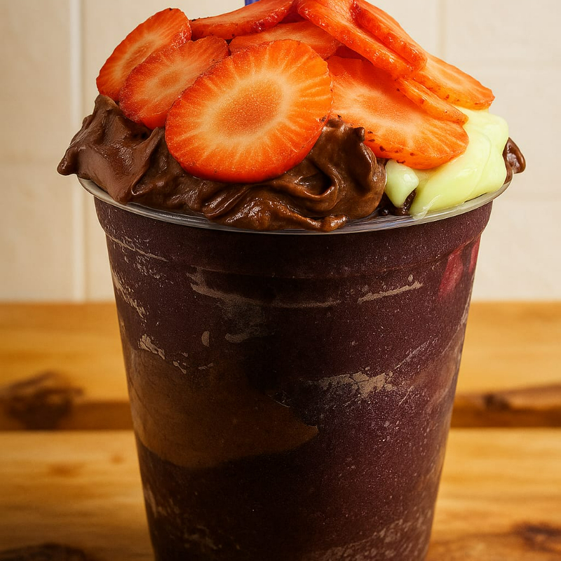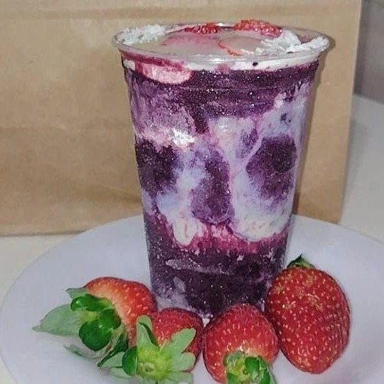 Creme de açaí com morango, avelã e leite em pó.