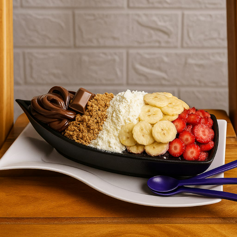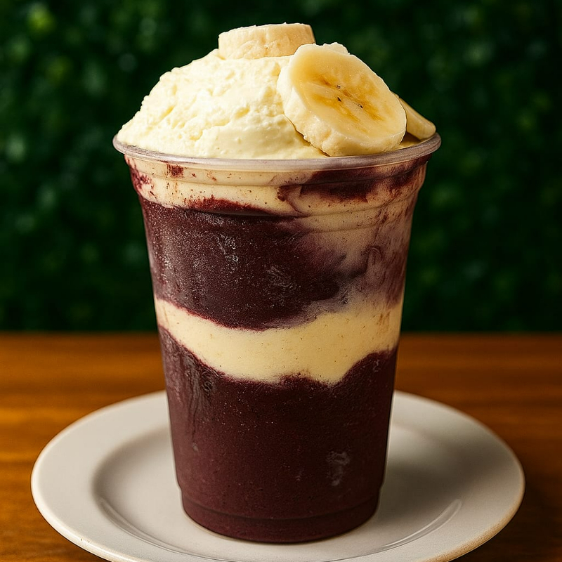Creme de açaí, banana, morango, leite condensado, leite em pó, avelã, paçoca. Os adicionais vão separados em copos de 100 ml. Não trocamos adicionais, apenas retiramos.