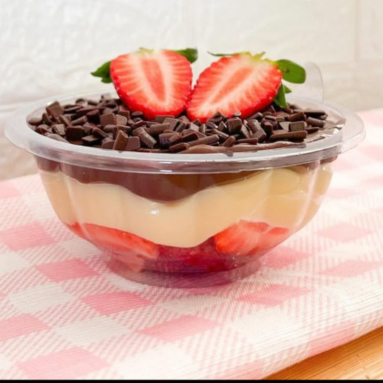 Delicioso Bombom Aberto de Morango revestido por uma camada de creme de Ninho e uma de chocolate meio amargo. 150ml