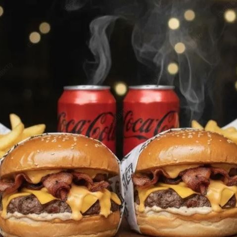 Hambúrguer - 1 Delicioso Mv burguer ,pão brioche burguer 150 queijo mussarela alface americana tomate e molho da casa .1 Delicioso Fabuloso pao brioche delicioso burguer 150 gramas queijo cheddar bacon fatiado e molho da casa 2 refri lata (Guaraná ou coca) + 2 batatas fritas