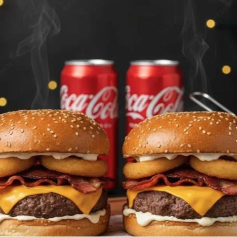 Pão Brioche, delicioso Burguer 150g, deliciosas cebolas empanadas, queijo cheddar, bacon fatiado e maionese da casa + 2 Porçoes de Fritas e 2 bebidas