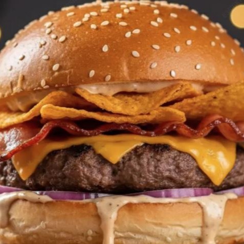 Pão brioche, hambúrguer 150g, queijo cheddar, Doritos, bacon fatiado, cebola roxa e molho zen.