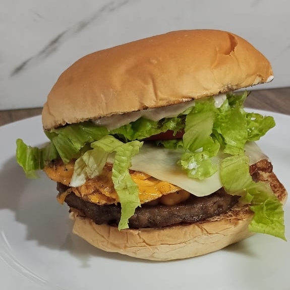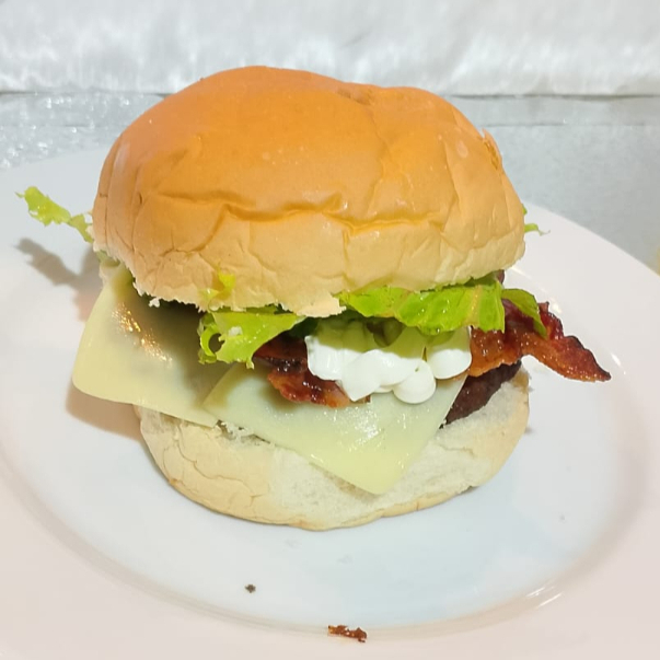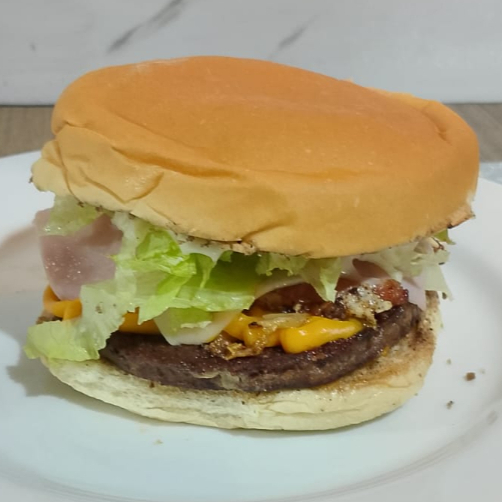 Pão Brioche, Carne 90g, Molho Cheddar, Ovo, Milho, Bacon, Presunto, Muçarela, Jota Molho, Alface, Tomate + 90g Batata Frita