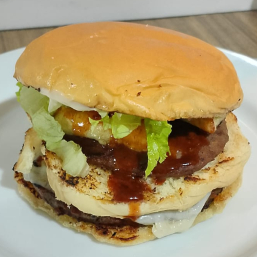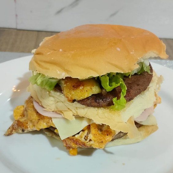 Pão Brioche, 2 Carnes 90g, Molho Cheddar, Ovo, Milho, Bacon, Presunto, Muçarela, Jota Molho, Alface, Tomate, Banana + 90g Batata Frita