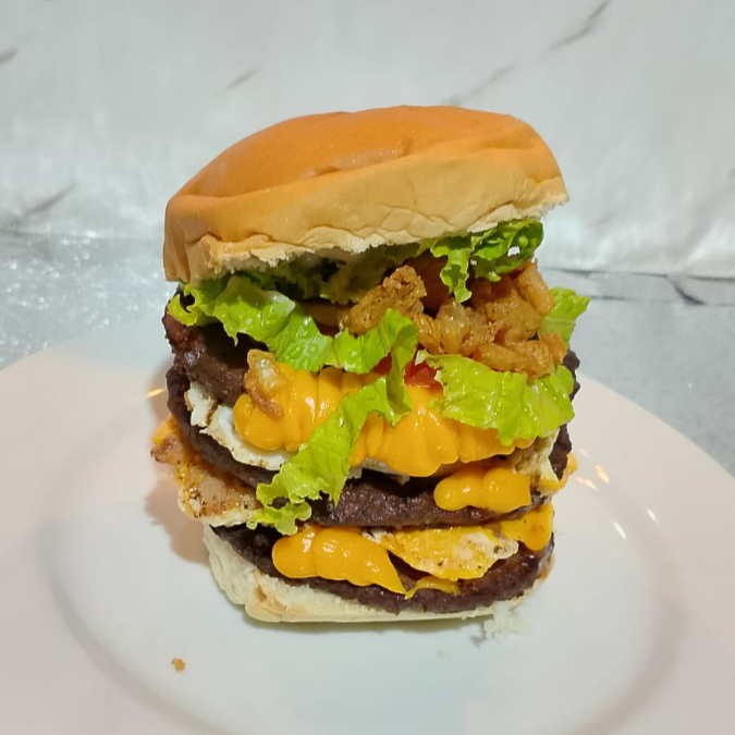 Pão Brioche, 3 Carnes 90g, Molho Cheddar, 2 Ovos, Bacon, Jota Molho, Alface, Tomate, Cebola Crispy + 90g Batata Frita