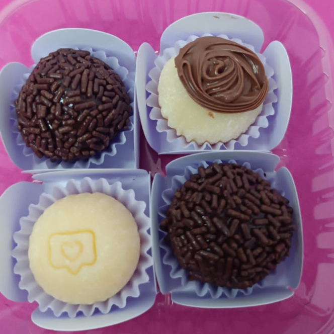 caixinha com 4 doces fresquinhos sendo 1 ninho, 1 ninho com nutella, 2 brigadeiros tradicionais