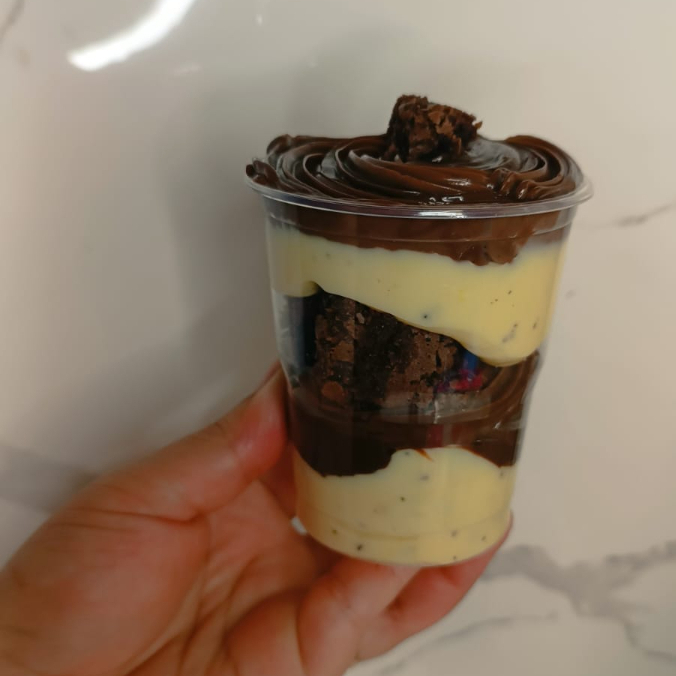 delicioso bombom no pote com um creme de ninho pedaços de brownie finalizado com chocolate