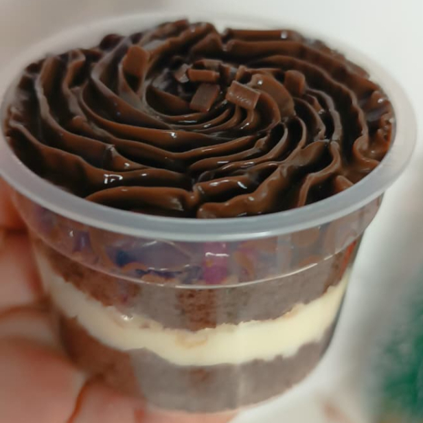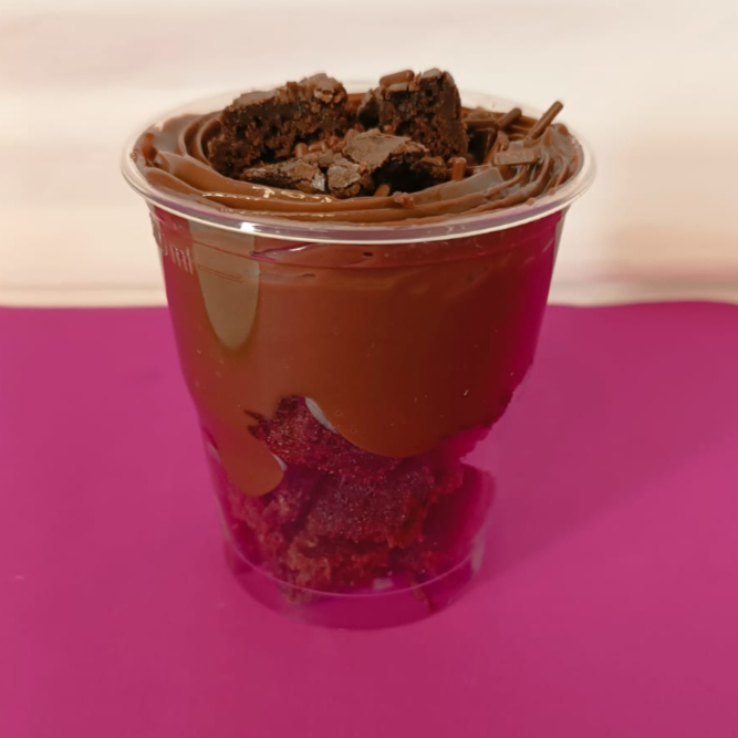 Mini bolo no pote com massa de chocolate, recheado com brigadeiro cremoso e Ninho. Doce na medida certa, fresquinho e irresistível