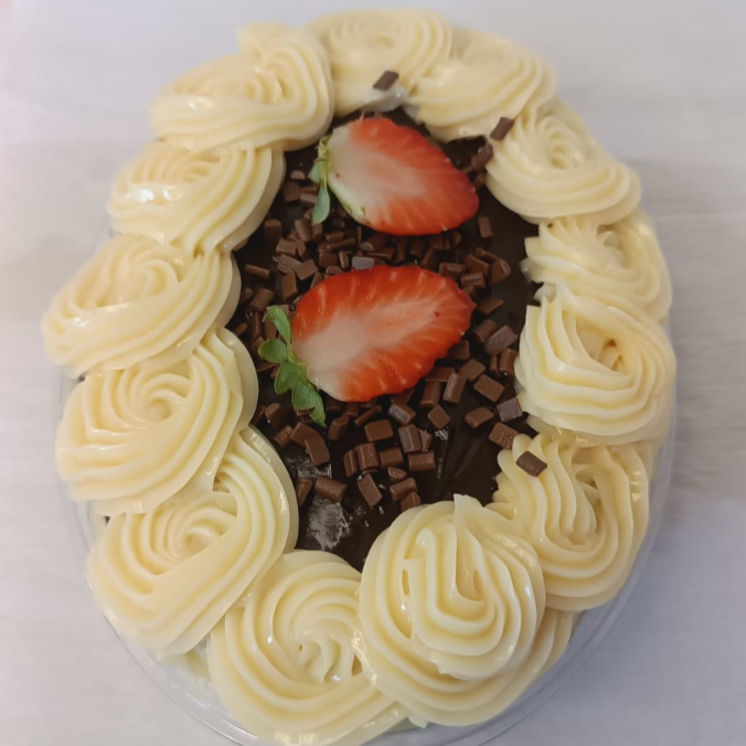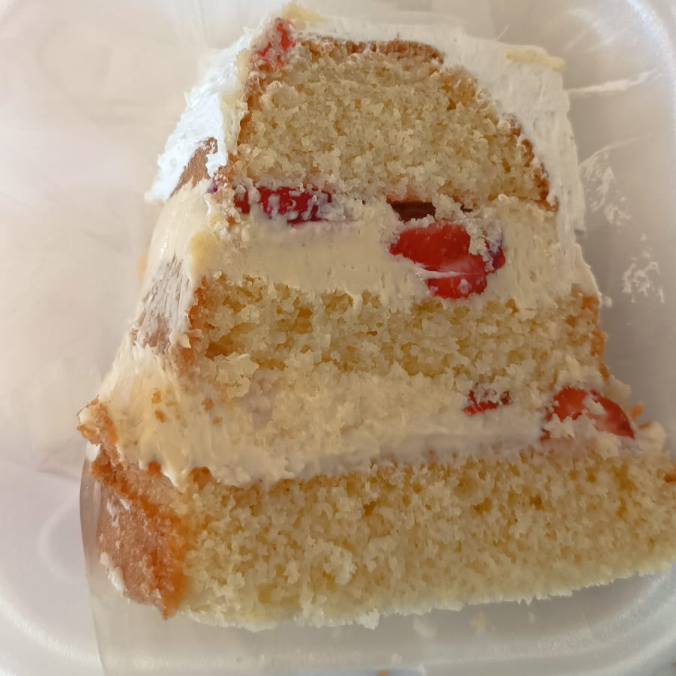 Fatia de bolo com massa macia e molhadinha, recheada com mousse cremoso de leite Ninho e morangos frescos selecionados, trazendo o equilíbrio perfeito entre o doce e o leve azedinho da fruta. Finalização delicada que deixa essa combinação simplesmente irresistível.