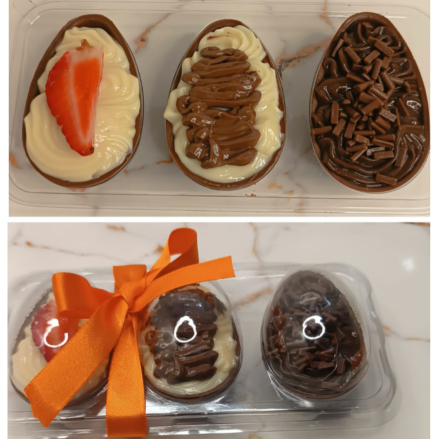 3 Mini Ovos de Colher recheados com Ninho com morangos, Ninho com Nutella e Brigadeiro. 🍫🥄 Uma combinação deliciosa, cremosa e perfeita para quem ama chocolate! Ideal para presentear ou se deliciar.