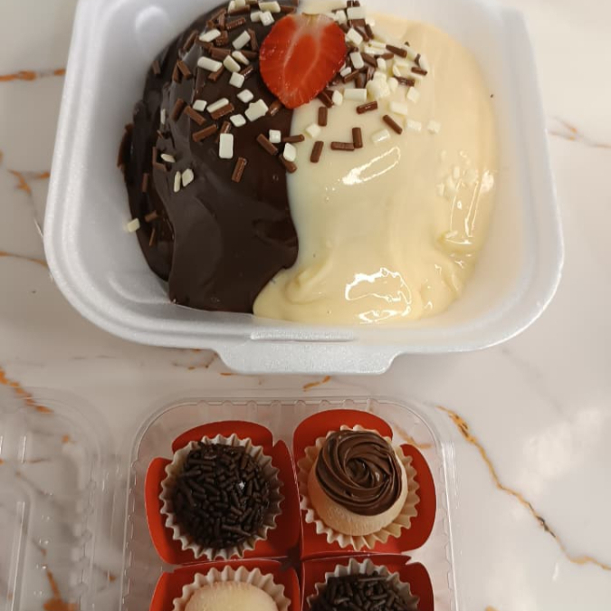 Combo com 1 mini bolo vulcão Dois Amores, cobertura de creme de Ninho e brigadeiro, finalizado com confeitos e morango. Acompanha 1 caixinha com 4 doces tradicionais. Produto artesanal, feito com carinho.