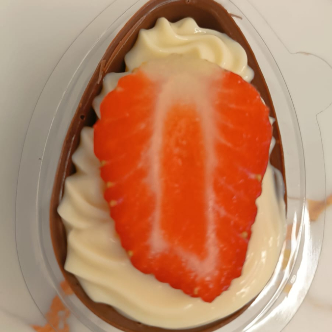 Casquinha de chocolate recheada com creme de Ninho super cremoso e morangos frescos. Uma combinação deliciosa e perfeita para adoçar sua Páscoa! 🐰✨