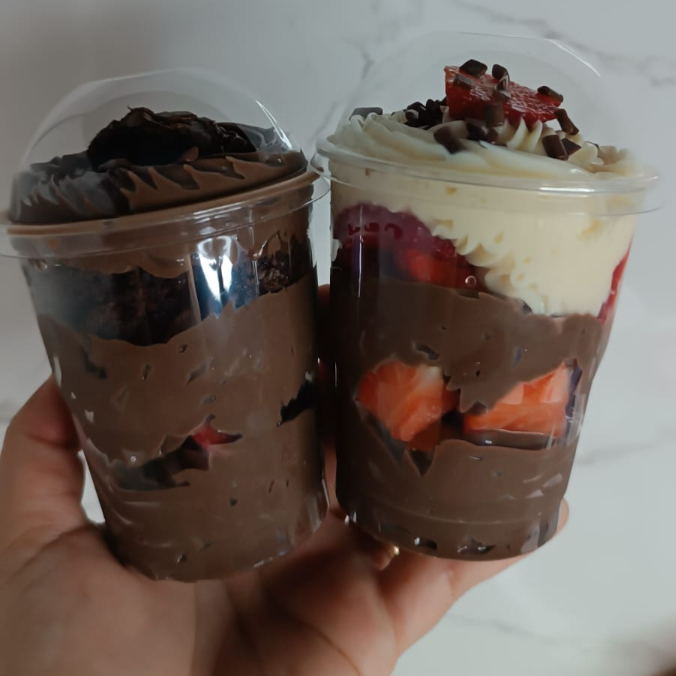Combo com duas delícias Copo da Felicidade Duplo Chocolate com morangos e toque de Ninho + Bombom no Pote Chocolatudo com brownie, morangos e cobertura de chocolate